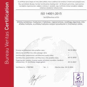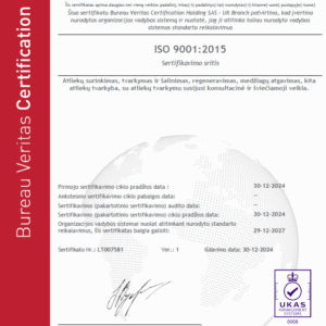 Norime pasidžiaugti, kad praėjusių metų pabaiga Kauno regiono atliekų tvarkymo centrui buvo itin reikšminga. 2024 m. gruodžio 30 d. įstaiga oficialiai gavo du tarptautinius ISO sertifikatus – ISO 14001:2015 aplinkosaugos vadybos ir ISO 9001:2015 kokybės vadybos standartus. Šis svarbus žingsnis žymi mūsų įsipareigojimą siekti aukščiausios kokybės, veiklos efektyvumo ir aplinkosaugos sprendimų užtikrinimo.